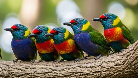 Close-up a Blue-throated barbet perch on the tree branch in sunlight, bright green, blue and red plumage against the green tropical forest in the background. Western Thailand.