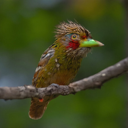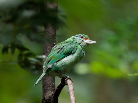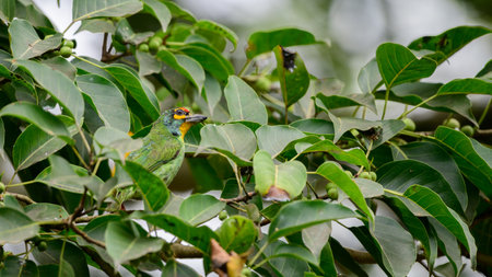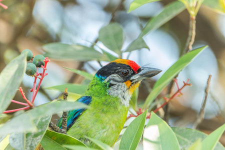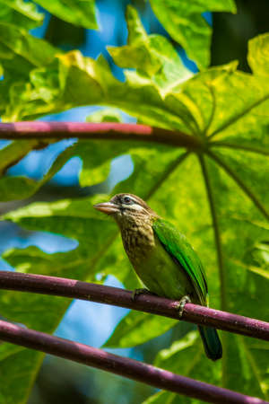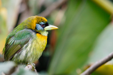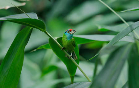Small green barbet. The blue-throated barbet bird on a tree with green blurry background, it's an Asian barbet native to foothills of the Himalayas and Southeast Asia.
