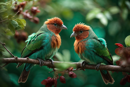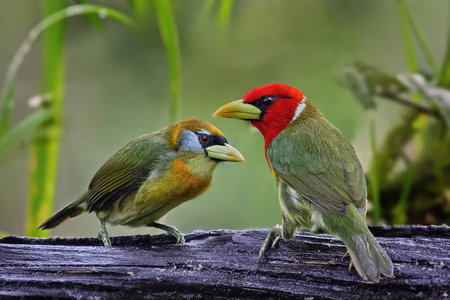 Red-headed Barbet - Eubucco bourcierii: A Vibrant Avian Gem of the Capitonidae Family, Thriving in the Humid Highland Forests. Male and female sitting nearby.