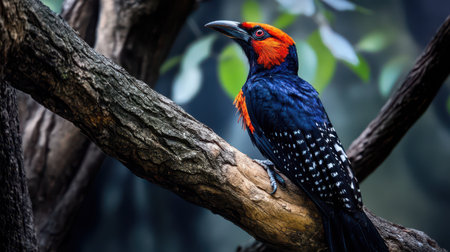 Generative AI : Beautiful bird Blackandred Broadbill Cymbirhynchus macrorhynchos rest on branch in nature