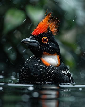 A vibrant bird with striking colors rests on a branch surrounded by lush greenery. Its bright features stand out in the natural setting.