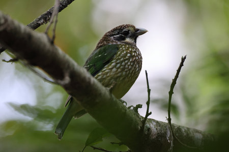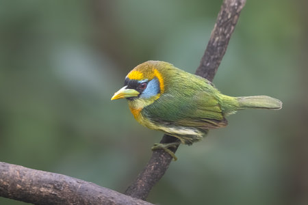 Blue-throated barbet(Chlorophanes caeruleus) perching on a branch