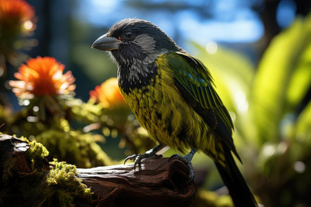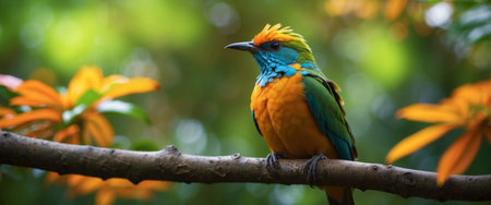 Bright exotic bird perched on a branch in a sunlit tropical garden with lush greenery and vibrant colors