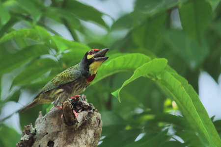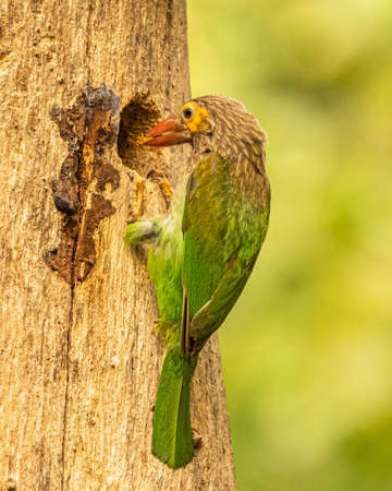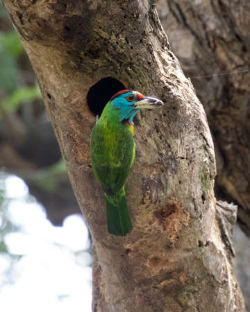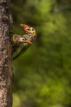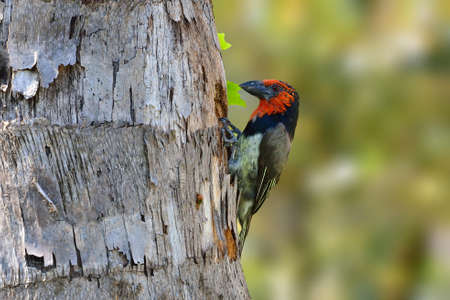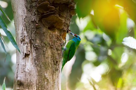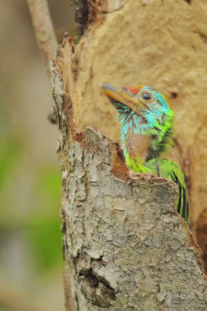 Asian barbet Nest in tree holes With wood drills a hole like a woodpecker. The birds of the same rank The cavity of Barbet will fit, making access to the nest, maybe not as much as a woodpecker.