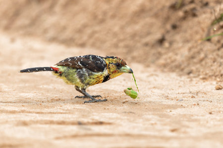 Crested barbet (Trachyphonus vaillantii) feeding during the day, Kruger National Park, South Africa