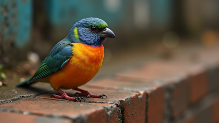 A beautiful vibrant painted bunting is perched on a brick wall, showcasing its stunning colors and plumage details in a natural outdoor setting