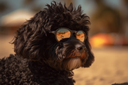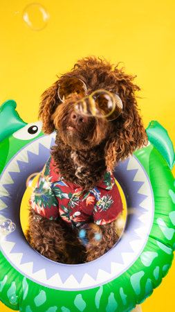 Brown dog wearing sunglasses and hawaiian shirt having fun inside inflatable ring with soap bubbles on yellow background