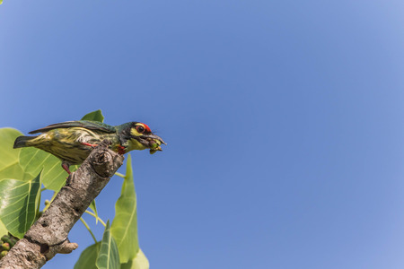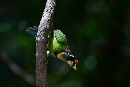 Colourful green bird ,Blue-throated Barbet ( Megalaima asiatica ) catching insect for feeding baby in highland forest.