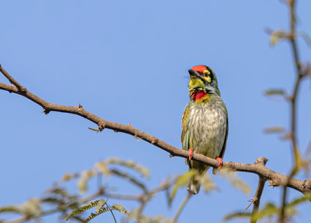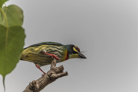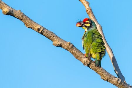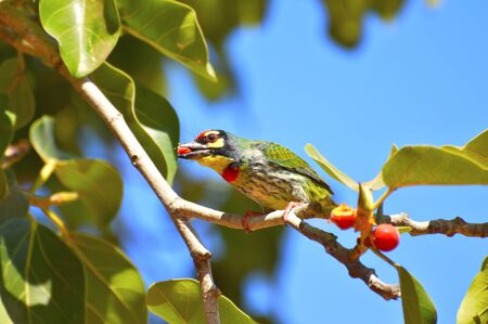 A coppersmith Barbet Bird perched on a branch eating a fruit
