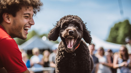 Agility contest with Poodle dog trainer navigates through vibrant obstacles