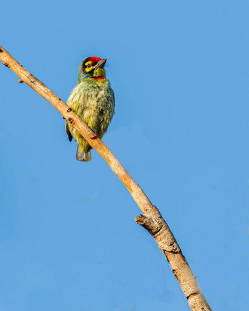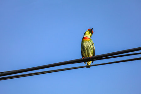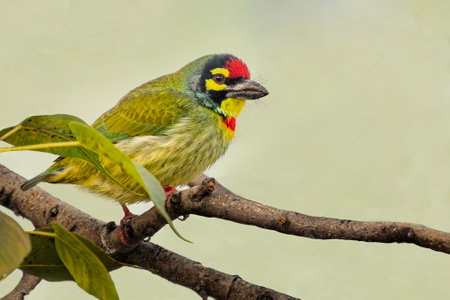 a male coppersmith barbet or crimson breasted barbet (psilopogon haemacephalus) is perching on a branch at chintamoni kar bird sanctuary in kolkata, west bengal in india