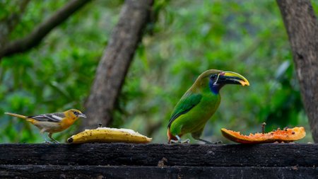 exotic bird feeding on fruit or berries in garden setting, created with generative ai