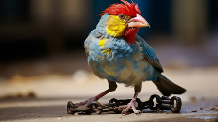 colorful bird perched on a chain, reminiscent of hugh kretschmer's style. this exotic subject matter showcases the precisionism influence, while also evoking imaginative prison scenes. the photo captures the essence of cryptid academia, with a touch of albert tucker's artistry. an intriguing associated press photo that merges various artistic elements seamlessly. ai generated