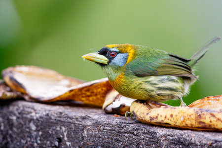 Closeup of a Taiwan barbet, or Psilopogon nuchalis, enjoying a papaya fruit
