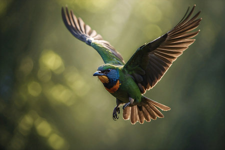 An AI generated illustration of A small bird soars gracefully against a bright, sunny sky, its wings spread wide