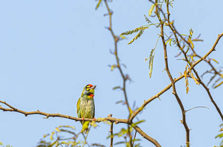 Coppersmith Barbet, Psilopogon haemacephalus on a branch at Sagareshwar wildlife sanctuary, Sangli, Maharashtra, India