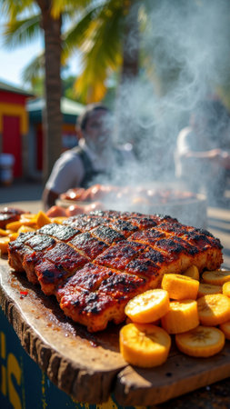 That the image is generated using AI. Juicy grilled ribs with corn at outdoor bbq event in tropical setting.