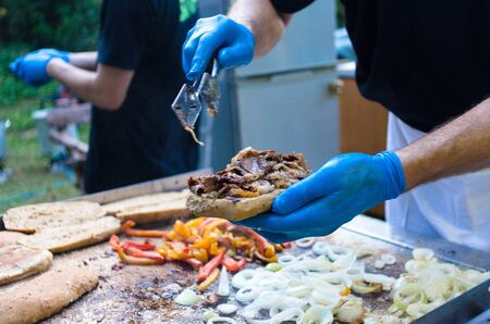 man roasting meat skewers on the street during a folk festival in italy, on out of focus background