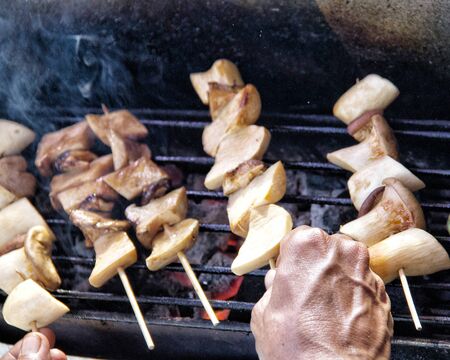 Grilling chicken meat skewers and skebab with vegetables on barbeque charcoal grill