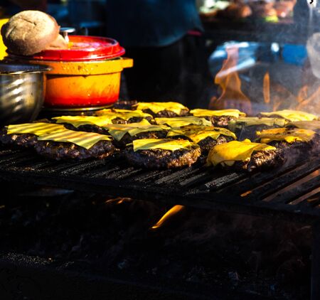 Cooking delicious juicy meat burgers on the grill outdoor. Selective focus