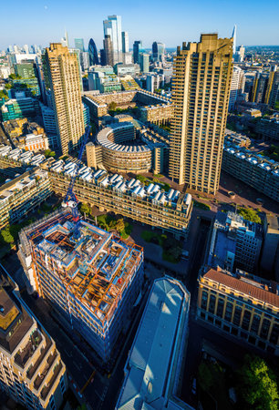 Vibrant aerial cityscape of the Barbican Estate in London, showcasing brutalist architecture, residential towers, and the financial district. Ideal for real estate, travel, and urban design use