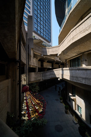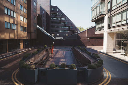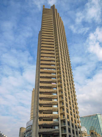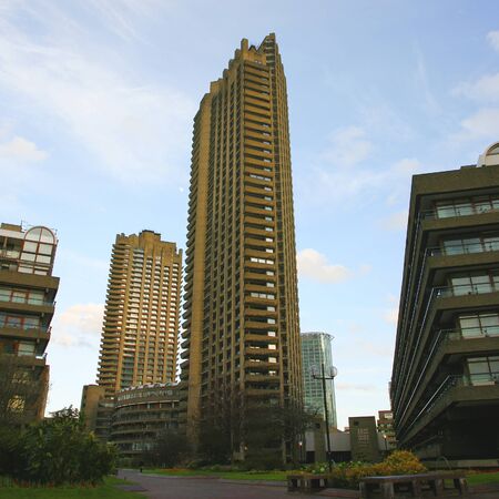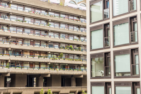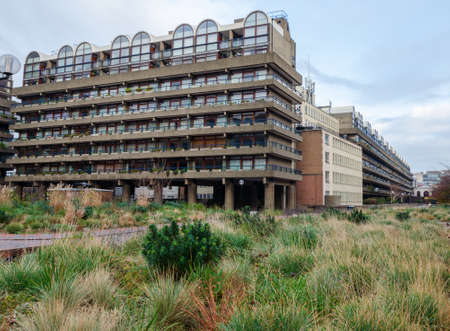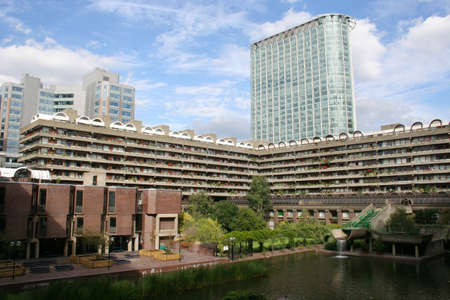 Residential area in Barbican Estate of the City of London. Unique architecture, residential area, travel, sightseeing, sights, tourism and urban development concept.