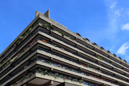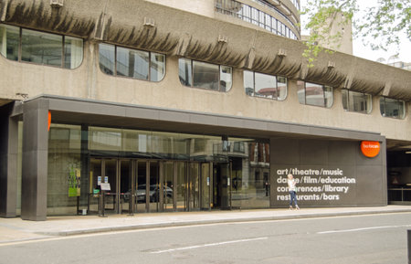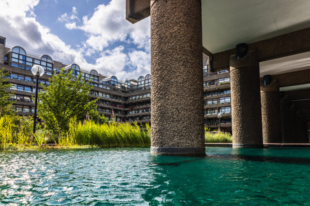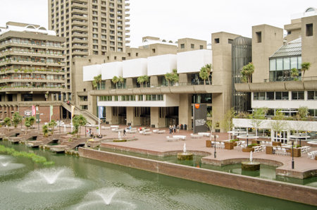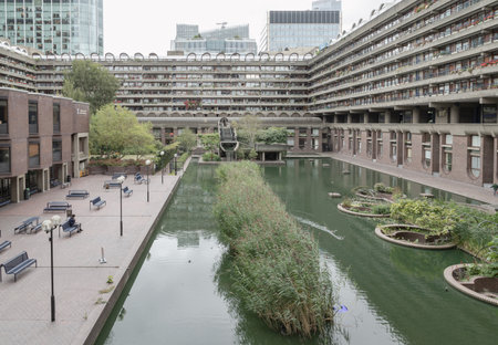 London, UK - Aug 18, 2025 - The Barbican Centre is a prominent cultural hub and a landmark of Brutalist architecture, as well as landscaped communal gardens and outdoor areas, including the prominent water features and greenery, located in the heart of London. It hosts a diverse range of artistic offerings including art, music, film, and performances across various genres. The complex features expansive spaces for exhibitions and events.