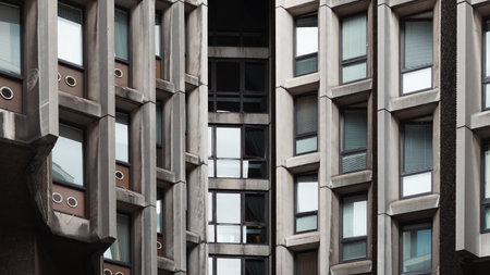 London, UK - Aug 18, 2025 - the distinctive textured concrete columns often referred to as béton brut (raw concrete) is a hallmark of Brutalist architecture, showcasing the style's emphasis on raw concrete and bold, geometric forms throughout its design and structural elements at the Barbican Centre in London. use it as your Wallpaper, Poster and Space for text, Select Focus.