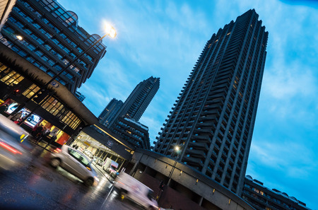 Traffic in front of the Barbican buildings, London, winter 2014.