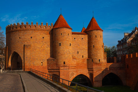 Warsaw, Poland, 13 October 2021: Barbican complex network of historic fortifications between Old and New Town, red brick fort wall with towers, major tourist attraction at sunny autumn day, city gate