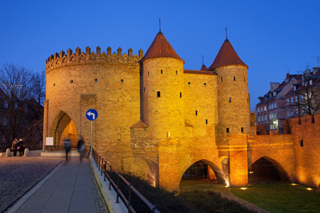 Barbican fortification of the Old Town, illuminated at night in Warsaw, Poland.
