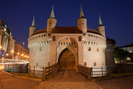 Barbican by night in Krakow, Poland. 15th century fortress, part of the old city wall fortification.