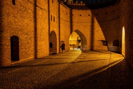 Night in the Old Town, light and shadow on cobblestone passageway through the Barbican fortification in city of Warsaw, Poland.
