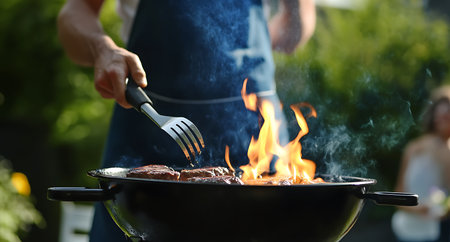A man is grilling steaks on a charcoal barbecue in a lush backyard during a summer evening. The image captures the essence of outdoor cooking with vibrant flames and a relaxed atmosphere.