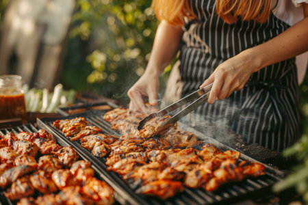Outdoor Summer Barbecue Party Woman Grilling Chicken Skewers On BBQ Grill With Bright Daylight AI Generative