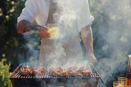 Individual grilling on an outdoor barbecue and sipping lemonade. Garden barbecue gathering in full swing.
