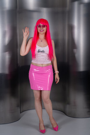 New York United States - March 20 2024: Barbie doll cosplay. Young beautiful sexy woman in camisole and pink skirt on silver background. Red hair girl wears pink wig with fringe