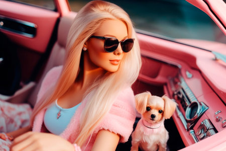 Barbie doll, with her dog Taffy, in her convertible pink car.