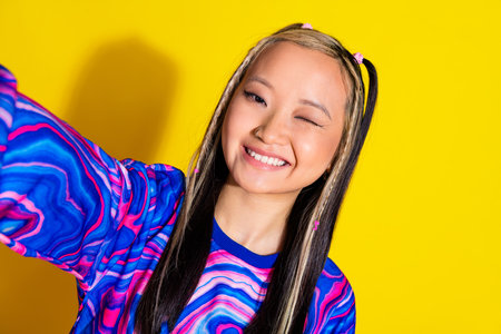 Portrait of good mood adorable woman with dyed hairdo wear print pullover making selfie winking eye isolated on yellow color background