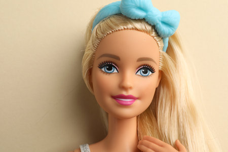 Italy, Milan - 10.12. 2023: Portrait of a Barbie doll with loose blond hair. Portrait of a Barbie. Shallow depth of field