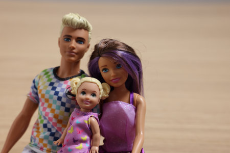 Leiden, Netherlands - September 20, 2023: Beautiful Barbie, Ken and Chelsea dolls on beige background, space for text
