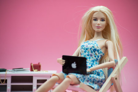 Mulhouse - France - 19 April 2021 - Portrait of blond Barbie doll wearing a blue summer dress sitting on wooden chair with an apple computer in hands on pink background