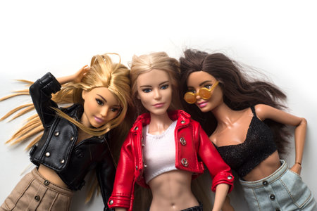 Mulhouse - France - 9 June 2021 - Portrait on top view of three Barbie dolls lying on white background