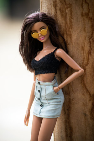 Mulhouse - France - 27 March 2021 - Portrait of brunette barbie doll wearing a blue jean's skirt and colorful top standing in the street