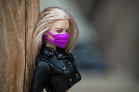 Mulhouse - France - 9 June 2021 - Portrait of blond barbie doll wearing a purple face mask in outdoor