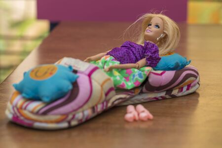 Krabi, Thailand - October 5, 2017: Barbie doll lying on wood floor.
