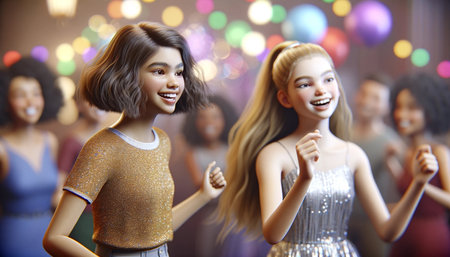 Two young women are dancing in a party scene. The girls are smiling and having fun, and there are other people in the background. The scene is lively and joyful, as the girls are enjoying themselves
