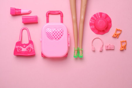 Miniature doll travel luggage with women's accessories on pink background. Vacation concept. Flat lay
