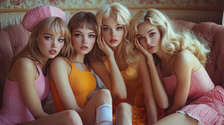 A dreamy image showcasing four beautiful women with stylish hairstyles and vibrant skirts. Capturing elegance, friendship, and fashion in a cozy setting.