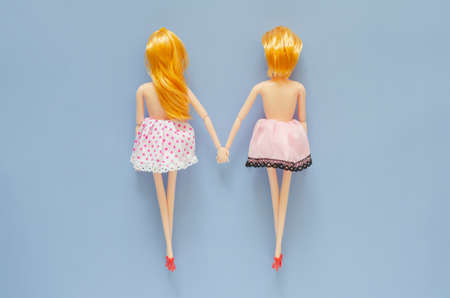Two female dolls naked on top holding hand with blue background. Pride day and zero discrimination concept.